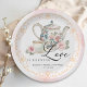Sirve encanto con este elegante plato de papel para brindis de boda “El amor está en el aire”! Con una tetera floral vintage, taza de té, rosas rosadas y detalles en pergamino dorado, este diseño de acuarela suave es un hermoso añadido a tu mesa de fiesta de té. Personalizado con el nombre de la novia y la fecha del brindis, es la combinación perfecta de belleza y función para una celebración con estilo.