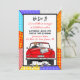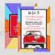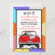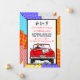 Coche convertible de arte pop retro vintage con novios y letrero de recién casados con latas colgando de la parte trasera de su coche alejándose después de la invitación a la fiesta.