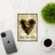 Hermosa invitación a la boda. Estas invitaciones tienen una imagen impresa de un cuadro acrílico de dos anillos bodas dorados. Estos anillos están uno al lado del otro dentro de un corazón. El fondo es de mármol dorado y blanco.