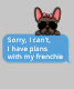 Esta graciosa sudadera frenchie presenta un lindo bulldog francés marrón con un mensaje de texto que dice "Lo siento, no puedo, tengo planes con mi francesa". Este lindo suéter también está disponible con diferentes bulldoges franceses de colores en diseños masculinos y femeninos.