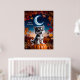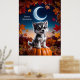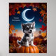 Un encantador ilustracion con temática de Halloween muestra a un adorable lobo sentado en una calabaza bajo una luna creciente, rodeado de hojas de otoño. Ideal para los amantes de los animales y de Halloween.