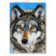 Una pintura de acrílico de un lobo gris sobre un fondo azul.