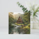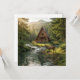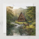 A serene blank notecard with a wilderness nature theme. The illustration is an a-frame log cabin out in the mountains and woods with a deer next to a rippling stream.