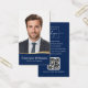 Tarjetas de visita de borde curvadas modernas, verticales, de color azul oscuro y dorado (degradado de color impreso, no Relieve metalizado real) con su nombre y título en los campos de la plantilla delantera y de personalizable para su información de contacto, logotipo y código QR en la parte posterior. Puede cambiar los colores de fondo y fuente, mover y cambiar el tamaño de los elementos con la herramienta de diseño.