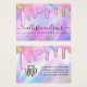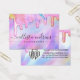 Esta tarjeta de exhibición de logotipo de negocio de aretes colgantes glamorosos y femeninos es la forma perfecta de estilizar su embalaje y agregar su propio estilo y personalidad. Cuenta con gotas de purpurina gruesa de color arcoíris de unicornio brillante impreso falso sobre un fondo iridiscente holográfico. La tipografía es un elegante guión cursivo con una fuente serif moderna para combinar. La paleta de colores incluye rosa, melocotón, azul, púrpura, amarillo y coral. Es chic, bonita, única y lujosa; la forma perfecta de anunciar su negocio y estilizar su material de marketing y publicidad para sus clientes. (los agujeros de los aretes son marcadores impresos solamente, la perforación debe ser completada por el cliente)