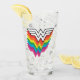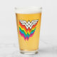 Orgullo DC| Logo icónico de Woman con capas de colores arcoiris proyectadas detrás de él.