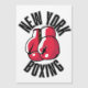La imagen muestra un par de guantes de boxeo rojos, posicionados en una posición clásica de lucha, con las palabras "NUEVA YORK BOXING" en negrita y negro rodeándolos. Los guantes están decorados con acentos blancos y encajes amarillos, lo que aporta un toque de realismo al diseño. El fondo es un blanco simple, lo que permite destacar el rojo vibrante de los guantes y el negrita del texto negro.