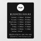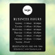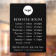 Crea fácilmente una señal personalizada de horario comercial con tu logotipo, horario y información de contacto. Pruébalo y vea cómo se ve. Agrega cualquier forma o logotipo con un fondo transparente o sólido. La imagen de tu logotipo encajará en la parte superior. Ajusta los días y las horas según las necesidades de tu negocio y agrega tus datos de contacto. Muchas opciones de señal disponibles para diferentes aplicaciones. Consulte la colección "Letreros Empresariales" para obtener letreros comerciales más útiles e informativos.