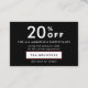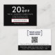 Esta sencilla y moderna tarjeta de descuento de cupones tiene un minimalista diseño en blanco y negro y un sencillo texto de personalizable. En la parte posterior encontrará un código QR de personalizable y un logotipo para reemplazarlo por el suyo propio. Perfecto para descuentos en eventos deportivos, u otro tipo de ofertas promocionales, para ayudarle a promocionar su negocio.