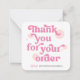 Los negocios de moda agradecen por la tarjeta de pedido en rosa y blanco con espacio para su logo y detalles de medios sociales. Con fuentes de estilo retro y colores elegantes, esta tarjeta de notas es perfecta para cualquier marca femenina o femenina. Añada el toque final a sus pedidos con este moderno agradecimiento por el diseño de las tarjetas de descuento de compra.