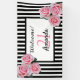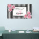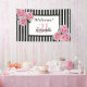Elegante, glamuroso y femenino para una fiesta de 21 años. Bandas verticales clásicas y de moda delgadas en blanco y negro. Decorado con flores rosas, rosas. Plantillas para un nombre y edad 21. Con el texto: ¡Bienvenido! ¡Girona y elegante! Letras negras y rosas. El nombre está escrito con una escritura de estilo con letras a mano moderna.