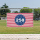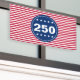 Two rows of white stars are on a blue circle. In celebration of America's 250th anniversary, 250 is in white letters are between the stars. It has red and white stripes in the background that are reminiscent of the American flag.