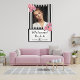 Elegante, glamuroso y femenino para una fiesta de 30 años. Bandas verticales clásicas y de moda delgadas en blanco y negro. Decorada con flores rosas, peonías y rosas. Plantillas para un nombre, edad 30, fecha de nacimiento y fecha del aniversario. Plantilla para su propia foto de tamaño vertical. Con el texto: ¡Bienvenido! ¡Girona y elegante!