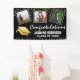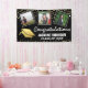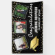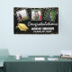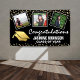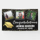 Un banner de graduación que te permite subir 3 fotos del graduado, decoración brillante de oro en un fondo negro, gorra de graduación dorada y un patrón moderno que es fácil de personalizar.