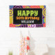 Stylish editable 70's party birthday banner featuring a decorative and colorful circle background and a birthday celebration template that is easy to personalize.