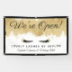 Promocione su salón de belleza, servicios de maquillaje y mucho más con nuestro elegante y lujoso banner abierto para negocios. El diseño presenta un elegante polvo falso purpurina dorado en la parte superior con "¡Estamos abiertos!" se muestra en una tipografía de escritura elegante. Diseño de pestañas en color negro y dorado personalizado con el nombre de su empresa. Un simple borde negro enmarca el cartel. Obra de Moodthology.