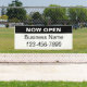 La línea superior del texto mostrado es blanca y dice AHORA ABIERTO. La segunda línea del texto es negra y se refiere a un mensaje personalizado (Mostrado: Nombre comercial). La línea inferior tiene dígitos de pantalla negros para un número de teléfono. Todo el texto se puede editar o eliminar.