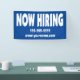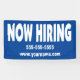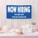 Ahora Contratar banner de letrero en blanco sobre fondo azul (o cambiar el color de fondo si lo deseas) para obtener atención y notar que tu negocio está ofreciendo empleo. Ahora disponible en tamaño más pequeño para ventanas o área de visualización pequeña. Edite las líneas de información para agregar su propia información de contacto u otro texto.
