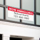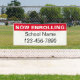 La línea superior del texto mostrado es blanca y dice AHORA ENROLLING. La segunda línea del texto es negra y es para un mensaje personalizado (se muestra: nombre escolar). La línea inferior tiene dígitos de pantalla negros para un número de teléfono. Todo el texto se puede editar o eliminar.