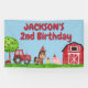 Celebra el gran día de tu pequeño agricultor con esta encantadora pancarta de cumpleaños de granja que presenta ilustraciones juguetonas de acuarela de un tractor rojo, árbol de manzanas, granero y animales de fiesta, incluyendo un caballo, cerdo y pollito, todos con sombreros festivos. Personalizada con el nombre y la edad del niño que cumple años, este diseño brillante de tema agrícola azul hace el fondo perfecto para fotos, mesas de postres o entradas. Ideal para niños pequeños y jóvenes que aman los animales, las granjas y la diversión al aire libre.