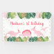 Este adorable cartel de cumpleaños incluye hojas de acuarela tropical con adornos de hojas de purpurina dorado y dinosaurios rosas.