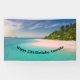 Birthday banner with a beautiful photograph. A scenic tropical beach with aquamarine water and a white sandy beach with a lush forest in the back. A solitary umbrella available for those who love seclusion.