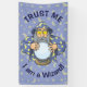 Viejo mago con capa azul mirando la bola mágica de cristal.