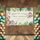 ¡Celebra los momentos especiales de la vida con esta encantadora pancarta temática de safari en la jungla! Con la frase "¡La aventura espera!" en elegante letra cursiva, este diseño muestra adorables animales de acuarela como una jirafa, cebra, león, elefante y mono, rodeados de exuberante vegetación tropical y hojas de monstera.