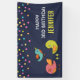 Una pancarta de cumpleaños con un trío de pájaros dibujados a mano adorables y extravagantes. Dos de los pájaros están de pie junto a algunos pequeños pinos verdes entre sus pies. Otro pájaro azul está volando en el aire entre ellos.