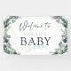 Bienvenido a tu ducha de bebé con un cartel diseñado con hojas de eucaliptos verdes de salvia acuática y verde con texto azul marino y escritura manuscrita de moda y personalizado con el nombre de la nueva madre o futura madre. Ideal para un niño o una ducha de bebé con temática neutra desde el punto de vista del género. Póngase en contacto con el diseñador a través de Zazzle Chat o makeitaboutyoustore@gmail.com si desea modificar este diseño, en otro producto o si desea coordinar elementos.