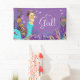 Banner de la sirena de la ducha de bebé con adorable sirena verde azulada de abeja sobre un fondo submarino de bonito con caballitos de mar y peces dorados, coral, plantas marinas y burbujas a elegir tu propio color de fondo. Este hermoso banner de la sirena bebé de la ducha se personaliza fácilmente para tu evento simplemente añadiendo el texto de tu elección.