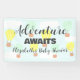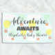 ¡Aventura espera! Ducha de bebé con globos de aire caliente verde menta y amarillo junto a nubes esponjosas.