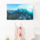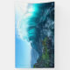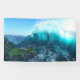 Una ola masiva salta de los mares agitados, blanco y azul brillante y turquesa a la luz del sol abrasadora. Bajo la ola, que está a punto de sumergirse, se encuentra una pequeña ciudad con un castillo y cabañas medievales construidas sobre un promontorio rocoso.