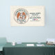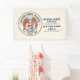 This vintage-style circular logo features a cheerful female pastry chef wearing a traditional white chef's hat and apron. She is framed by a warm orange circular backdrop and holds a wire whisk in one hand and a flaky croissant in the other, symbolizing her culinary expertise. Below her, a blank, elegant parchment scroll spans the bottom of the emblem, providing a perfect space for a bakery’s name. The design uses a clean, two-tone color palette of navy blue and burnt orange with a slightly distressed texture, giving it a professional yet classic artisanal feel.