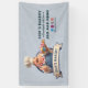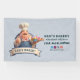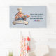 A charming 3D cartoon illustration of a friendly, portly pastry chef with a cheerful smile and a well-groomed mustache. He is dressed in a professional white chef's hat (toque), a vibrant red-and-white striped neckerchief, and blue denim overalls over a white shirt. The chef gives an enthusiastic thumbs-up while balancing a silver tray filled with colorful treats, including frosted cupcakes and glazed donuts. The character is framed by a circular backdrop and a large, elegant blank banner at the bottom, designed for custom text or branding. The high-quality CGI style and warm aesthetic make it an ideal mascot for a bakery or confectionery.