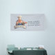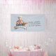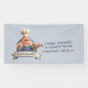 A charming 3D cartoon illustration of a friendly, portly pastry chef with a cheerful smile and a well-groomed mustache. He is dressed in a professional white chef's hat (toque), a vibrant red-and-white striped neckerchief, and blue denim overalls over a white shirt. The chef gives an enthusiastic thumbs-up while balancing a silver tray filled with colorful treats, including frosted cupcakes and glazed donuts. The character is framed by a circular backdrop and a large, elegant blank banner at the bottom, designed for custom text or branding. The high-quality CGI style and warm aesthetic make it an ideal mascot for a bakery or confectionery.