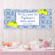 Baldosas modernas, elegantes, portuguesas, limones azules y blancos, españolas, italianas, mediterráneas, verano ducha de novia Banner de bienvenida. Perfecto para recién casados. Puedes personalizarlo con los nombres y fechas de la novia y el novio.