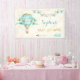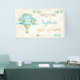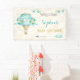 Globo de aire caliente en azul turquesa, verde azulado, aqua, dorado, amarillo y gris con flechas y rosas. Un lugar en el banner que personalizar con un nombre o frase. Sobre un fondo de color dorado.