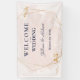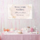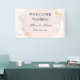 Una elegante bandera colgante de recepción de boda diseñada con fondo rosa, texto azul marino y toques dorados. El texto incluye: Bienvenidos a nuestra boda, los nombres de la pareja y la fecha de la boda. Para personalizar, simplemente inserte sus datos en nuestra plantilla fácil, reemplazando el texto de muestra. Asegúrese de ver toda la colección de bodas rosa y dorado para tarjetas y accesorios a juego.