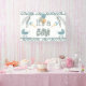 Pancarta de la ducha de bebé Buggy Boy para añadir a tu decoración fiesta con "¡Es un niño!" en colores salvia, gris claro y azul acuático. Decorada con 2 carrozas, sondas para bebés, un ramo de globos y ramas con hojas en colores alternados de gris claro y salvia. Bordes de rayas entrecruzadas en la parte superior e inferior del cartel. Una adición perfecta a una ducha de bebé como punto focal que unirá el tema.