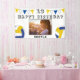 Bandera de voleibol Banderas de niños foto Cartel de la fiesta de cumpleaños. El diseño tiene dos bolas de voleibol y banderas de fiesta de cumpleaños con colores amarillos, azules y blancos. Añade tu foto y la personaliza con tu nombre, edad y texto y haz tu propio banner de fiesta de cumpleaños. Ideal para niños y chicas que aman el voleibol.