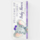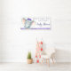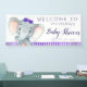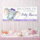 Banderín de baby shower de elefante para niñas con un adorable elefante bebé con un lazo morado en un fondo de franja morada. Este banner de baby shower de elefante se personaliza fácilmente con tus datos.