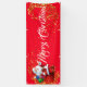 Este banner de Navidad Holiday se muestra en el estilo exterior. Seleccione entre interior o exterior, con o sin mangas. Mostrado en Rojo con "Feliz Navidad" blanco con Santa y sofisticado guión con dos remolinos de estrellas de aspecto dorado en cada extremo. Personalizar o compra según el diseño.