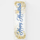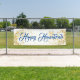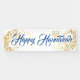 Este cartel de vacaciones se muestra en el estilo exterior. Seleccione entre interior o exterior, con o sin mangas. Mostrado en blanco con el texto azul "Happy Hanukkah" en un guión elegante con dos estrellas de aspecto dorado en cada extremo. Personalizar o compra según el diseño.