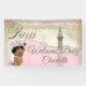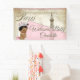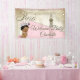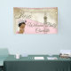 Pancarta de la ducha de bebé de París con una adorable bebé africana norteamericana que usa una corona de bonito y un cordel de perlas en un hermoso paisaje de París rosado. Esta bonita pancarta de la ducha de bebé de París se personaliza fácilmente para tu evento simplemente añadiendo el texto de tu elección.