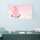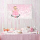 Pancarta de ducha rosa y gris con adorable bebé vintage con un hermoso vestido y zapatos rosados en un fondo de encaje negro rosa y gris plateado con una cuerda de perlas y sonrisas de plata en las manos. Puedes añadir el texto de tu elección para personalizar este adorable bokeh y este banner de ducha de leche rosa y gris para tu ocasión.