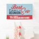 Los colores de época con un diseño moderno crean un maravilloso cartel de reunión familiar para su próxima reunión del clan. Ponga su pancarta monogramada de reuniones familiares en su picnic en el parque, fiesta de playa familiar o fiesta de la piscina de barbacoa en el patio trasero. Tema de color azul, negro y blanco.