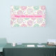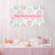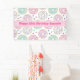 Pancarta de cumpleaños con un patrón deliciosamente divertido. Ilustracion de donuts de color rosa pastel y verde con salpicaduras y glaseado.
