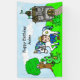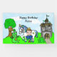 Pequeño príncipe de pelo marrón con corona y espada, y su caballo de mascota, dragón y rana con un castillo y árbol con un búho en el fondo, banner de cumpleaños personalizado.