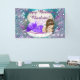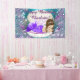 Banner de la fiesta de cumpleaños de la sirena brunette adorable princesa sirena bebé en una cáscara de arcilla de color perla de bonito con perlas y joyas en un color morado y azul verde azulado bajo el fondo del mar. Puede personalizar fácilmente este lindo banner de cumpleaños de sirena para su evento agregando el texto de su elección. Se trata de un diseño impreso sin purpurina, perlas, joyas, etc.